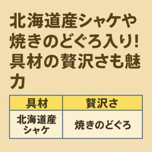 - ✅ 北海道産シャケ・焼きのどぐろなど贅沢な具材入り
