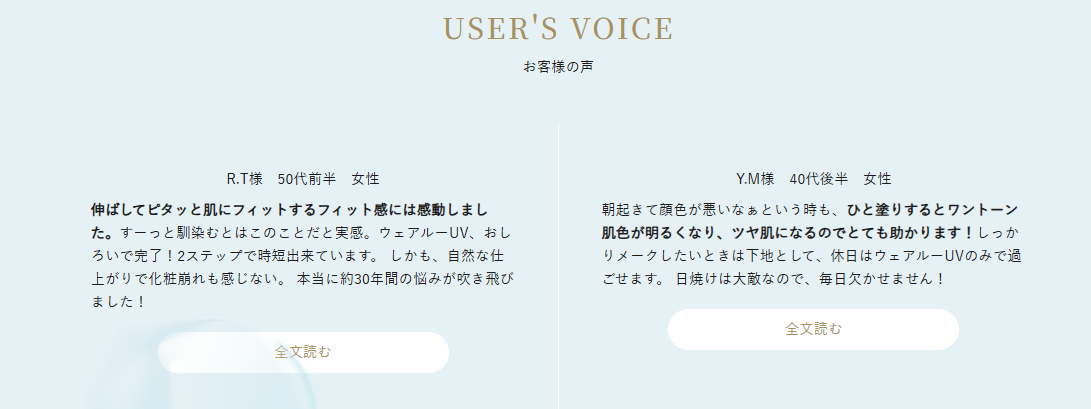 | 持っているファンデと合わせて使える? | ファンデーション(クリーム・パウダータイプ)をお持ちの方はその下地として、日焼け止めや無色の下地をお持ちの方は上に重ねてお使いいただけます。ウェアルーUV自体に十分な保湿成分が含まれておりますので、できるだけ油分の少ないものと一緒にご使用いただくことをおすすめいたします。※仕上げのパウダーをお求めの方は同じベースメイクシリーズで相性の良い<ウェアルーパウダールーセント>のご利用をおすすめしております。 |
