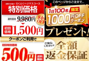| 定期初回割引価格 | 1,500円(税込) さらに1日100名限定1,000円OFFクーポンで 500円(税込) |