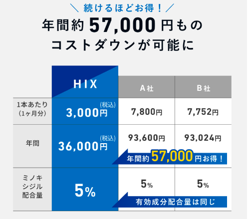 ヒックスミノキシジル5と大手のヘアケアの値段を比較