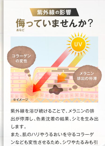有効成分が配合日焼け止めと同時に美肌ケアx年齢肌対策が可能紫外線の影響で気になる、シミとシワシワ対策ができる