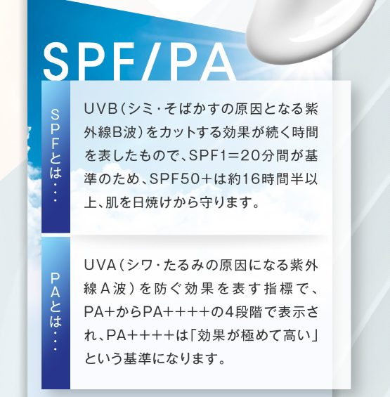 | PAとは? | UVAを防ぐ効果を表す指標 PAからPA++++の4段階で表示され PA++++は効果が極めて高いという基準になります |