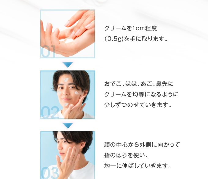 | 3 | 顔の中心から外側に向かって指の腹を 使い均等に伸ばします手に残った分は首元やデコルテに使用してください |