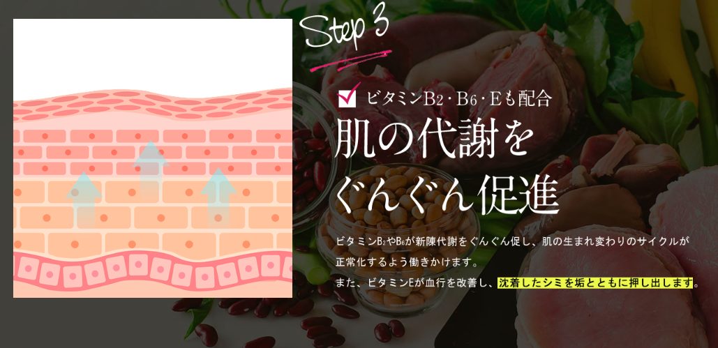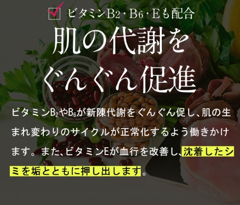ビタミンB2やB6が新陳代謝をグングン促し、肌の生まれ変わりのサイクルが正常化するように働きかけます