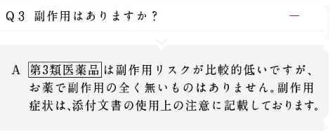 - 服用後、発疹・発赤、かゆみ、吐き気、腹痛などが現れた場合は服用を中止し、医師・薬剤師等に相談。