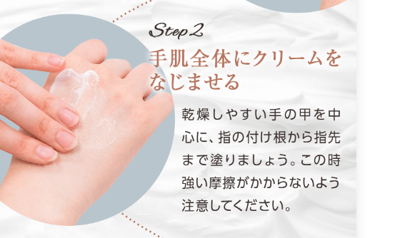 手肌全体にクリームをなじませる 乾燥しやすい手の甲を この時強い摩擦が掛からないように注意してください |