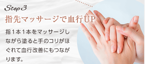 | 指先マッサージで血行UP 指1本1本を マッサージしながら塗ると 手のコリがほぐれて 血行改善にもつながります |
