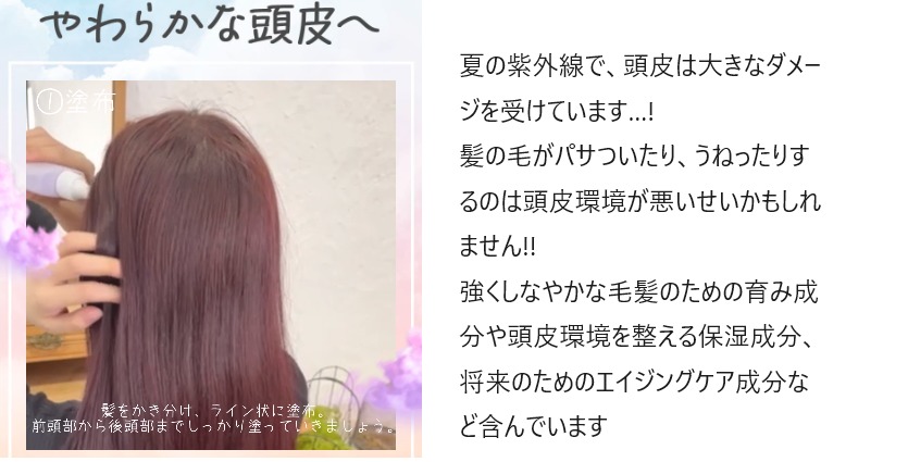 | ご使⽤⽅法 | 洗髪後や朝のお手入れ時など、1日2回を目安にご利用ください。 ・髪の水気をよく拭き取り、生え際から後頭部まで頭皮全体に直接つけ、指の腹でやさしくマッサージしながらなじませてください。 |