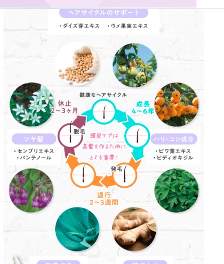 | 原材料/成分 | 水、プロパンジオール、ペンチレングリコール、BG、PEG-40水添ヒマシ油、PEG-60水添ヒマシ油、シクロヘキサン−1,4−ジカルボン酸ビスエトキシジグリコール、キサンタンガム、カルボマー、グリチルリチン酸2K、パンテノール、センブリエキス、ラベンダー油、アロエベラ液汁、ウメ果実エキス、水添レシチン、チャ葉エキス、アスコフィルムノドスムエキス、グリセリン、ダイズ芽エキス、トコフェロール、フカスセラツスエキス、オタネニンジン根エキス、クズ根エキス、アカヤジオウ根エキス、コンフリー葉エキス、ジラウロイルグルタミン酸リシンNa、アシタバ葉/茎エキス、ビワ葉エキス、ローマカミツレ花エキス、アルニカ花エキス、オドリコソウ花/葉/茎エキス、オランダガラシ葉/茎エキス、ゴボウ根エキス、セイヨウキズタ葉/茎エキス、ニンニク根エキス、セイヨウアカマツ球果エキス、ローズマリー葉エキス、ボタンエキス、ソルビトール、ウンシュウミカン果皮エキス、カンゾウ葉エキス、ダイズ種子エキス、スサビノリエキス、ヒバマタエキス、水酸化K、酢酸トコフェロール、フェノキシエタノール |