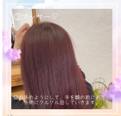 軽く指を立てて、額から後頭部にかけて、手でブラッシング