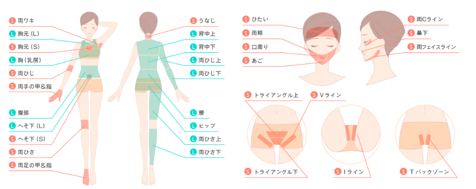 顔、うなじ、胸(乳房)、Iライン、トライアングル上下、Tバックゾーンを除く全身18部位から5部位から選べるプランが用意されてます