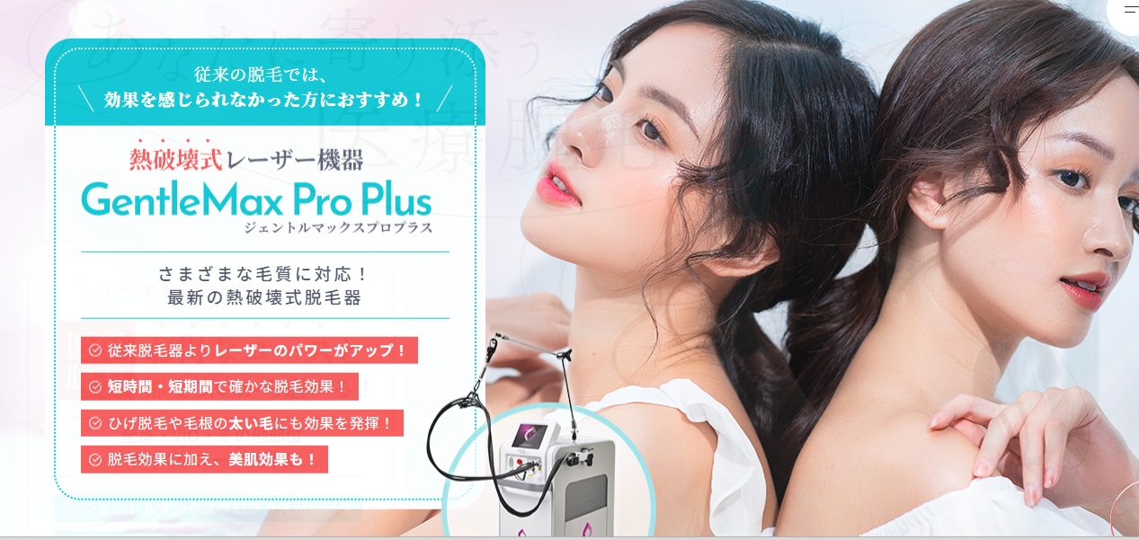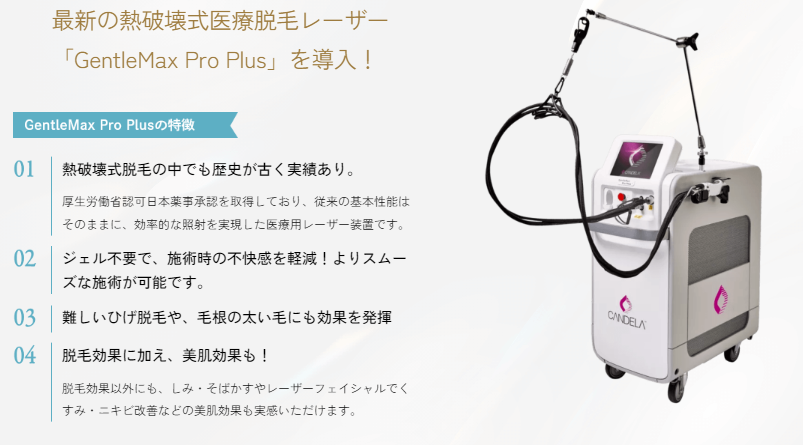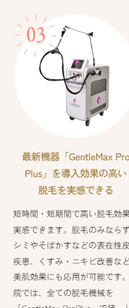 | 使用している脱毛器 | 当院では、「GentleMax Pro Plus」を使用しております。 熱破壊式脱毛機の中でも最新の「GentleMax Pro Plus」は、短時間・短期間で高い脱毛効果を実感可能なため多くの患者さまに喜ばれております。 |