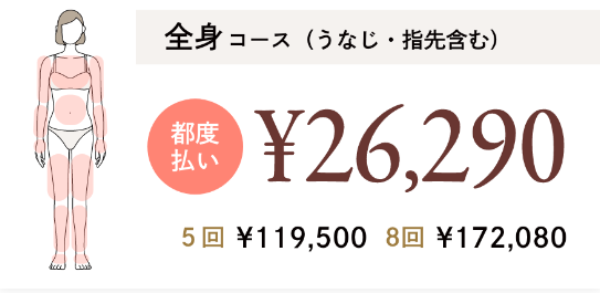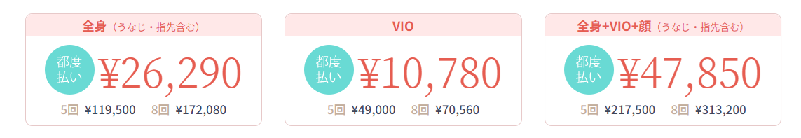 | 全身+VIO(うなじ・指先含む) 5回の値段 | 168,500円(税込) |