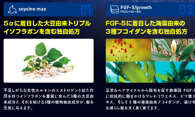 | FGコントロール5 | FGF-5に着目した海藻由来の 3種のフコイダンを含む成分 |