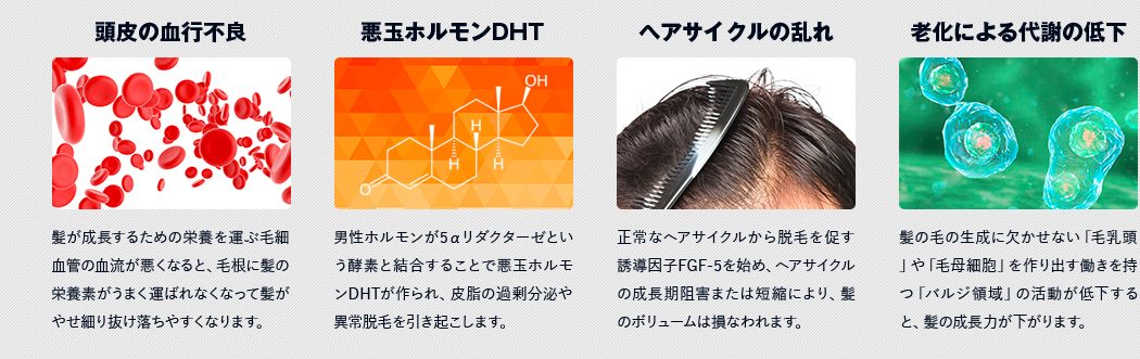 | ヘアサイクルの乱れ | 正常なへサイクルから脱毛を促す 有動員し FGF-5をはじめ、 ヘアサイクルの成長期阻害によりまあ 短縮により髪のボリュームはそこなれます |