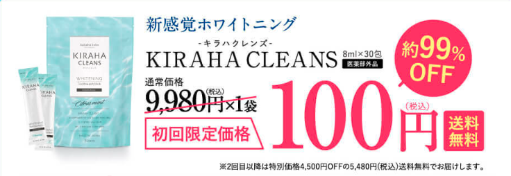 | キラハクレンズのメリット | ★ごっそりとれた口内の汚れが一目でわかる ★歯科医も注目 ★独自処方の美白3ステップ! ★口臭予防成分で香りもキレイ! |