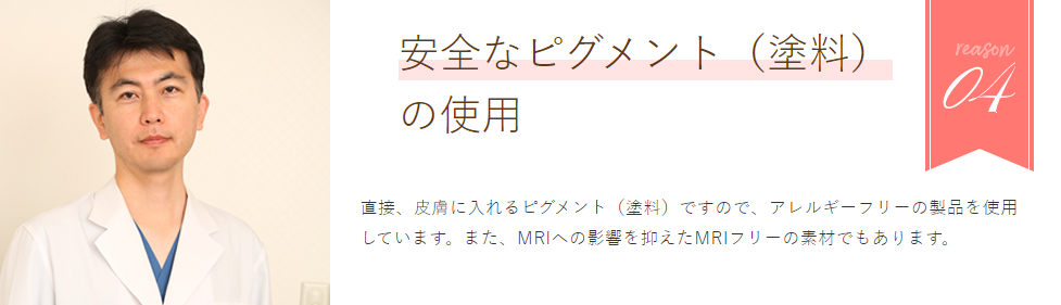 直接、皮膚に入れるピグメント(塗料)ですので、アレルギーフリーの製品を使用しています。また、MRIへの影響を抑えたMRIフリーの素材でもあります