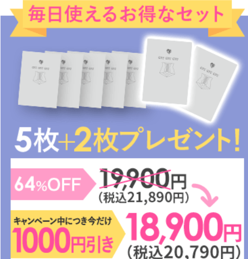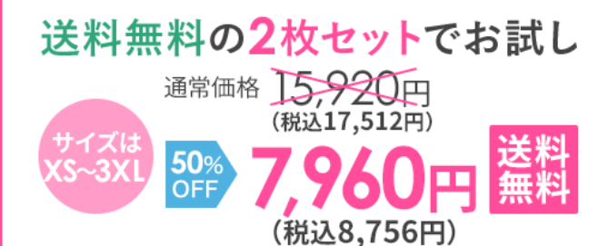 | 各プランの値段 | 5枚+2枚プレゼント 通常価格21,890円(税込) 1000円引きの20,790円(税込)3枚+1枚プレゼント通常価格13,134円(税込) 500円引きの12,584円(税込)送料無料の2枚セットの値段 通常価格17,512円 50%OFFの8,756円(税込) |