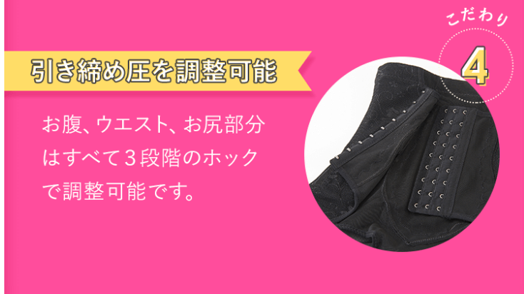 お腹・ウエスト・お尻部分はすべて3段階のホックで調整可能です✅