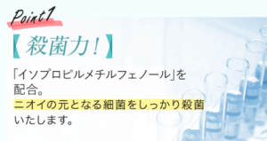 | 有効成分 | 菌の繁殖を抑えるイソプロピルメチルフェノール 制汗効果のあるパラフェノールスルホン酸亜鉛 |