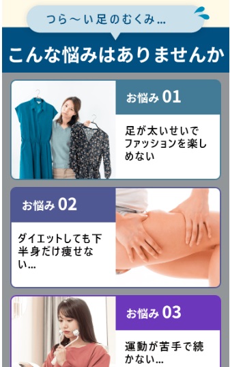 | おすすめの人 | 💁♀️足が太いせいでファッションを楽しめない人 💁♀️ダイエットをしても下半身だけ痩せない人 💁♀️運動が苦手で続かない人 💁♀️足のむくみが取れない人 💁♀️姿勢が悪く足の疲れが取れない人におすすめ |