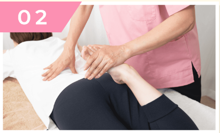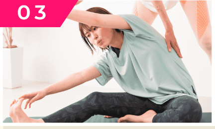 | 施術開始 | トレーナーとペアストレッチや 凝り固まった筋膜をほぐします |