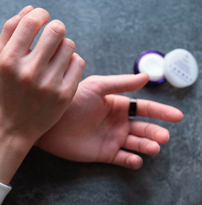 | 1 | クリームを塗るときの要領で練り香水の表面を指の 腹で軽くなでるように取ります |