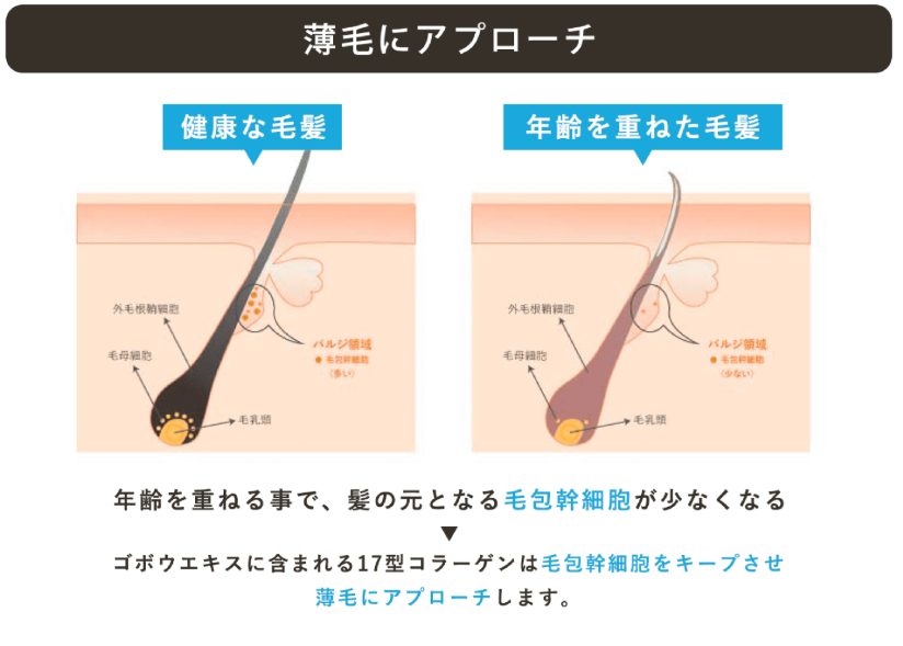 調べるうちにその成分が毛髪の健康に深く関わっていることを知りました。17型コラーゲンは頭皮環境を改善し、毛根を強化することで髪のボリュームを