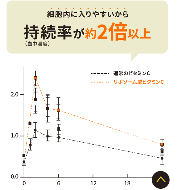 | 持続率 | 細胞内に入りやすいから血中濃度(持続率)が 通常のビタミンCの約2倍に! |
