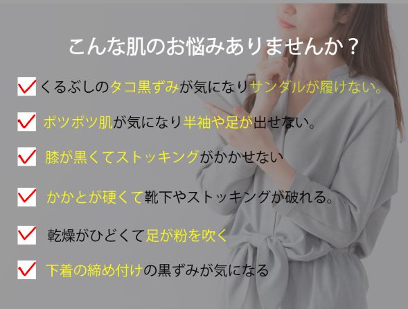 | おすすめの人 | くるぶしのタコ黒ずみが気になり サンダルがはけない人ポツポツ肌が気になり半袖や脚が出せない人 膝が黒くくてストッキングがかかせない人 かかとが硬く、靴下やストッキングが破れてしまう人 乾燥がひそくて足が粉を吹く人 下着の締め付けの黒ずみが気になる人におすす |