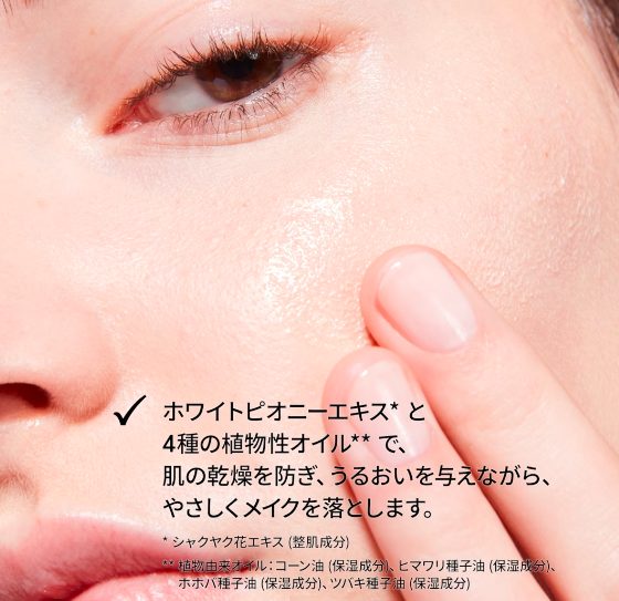 ホワイトピオニーエキス*と天然由来の植物性オイル4種を配合し、肌をやさしく労りながらも、濃いめのメイクもスルッと落とせる使用感が特徴です。