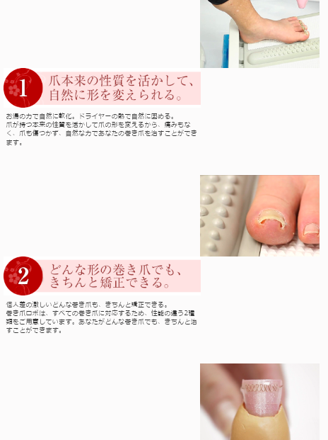 痛みから解放されて、きれいな爪になりたい」そんな巻き爪に苦しむあなたの夢を世界で初めて実現した、矯正革命「巻き爪ロボ」。従来の矯正具にはできなかった、思い通りに形を変える、つまり自分で「治せる」巻き爪矯正を世界で初めて実現しました。実際にモニターの方が巻き爪を治す風景を、長回しで撮影しています。あなたの爪が治るまでのリアルなドキュメンタリーとして、驚きの早さを疑似体験していただけますので、ぜひ一度、その目でお確かめください。