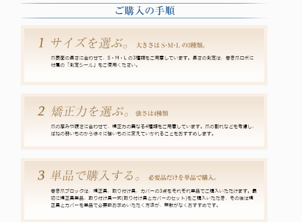 爪表面の長さに合わせて、S・M・L の3種類をご用意しています。長さの測定は、巻き爪ロボに付属の「測定シール」をご使用ください。強制力を選ぶ