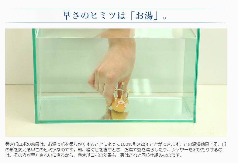 巻き爪ロボの効果は、お湯で爪を柔らかくすることによって100%引き出すことができます。この温浴効果こそ、爪の形を変える早さのヒミツなのです。朝、寝ぐせを直すとき、お湯で髪を濡らしたり、シャワーを浴びたりするのは、その方が早くきれいに直るから。巻き爪ロボの効果も、実はこれと同じ仕組みなのです。