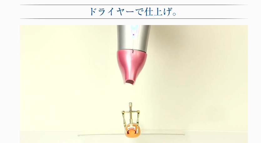 温浴効果で爪は驚くほど柔らかくなります。柔らかい爪は形を変えることも簡単ですが、逆に元の変形状態にも戻りやすいので、ドライヤーでしっかりと乾燥させ、仕上げをします。お湯で柔らかくした爪は、矯正後にしっかりと乾燥させることによって、矯正した形のまま、約10分で元の爪の硬さに戻すことができるのです。お湯とドライヤーで爪の形を、手早く、思いのままに。これも寝ぐせを直す仕組みと同じ、驚きの早さの隠れたヒミツなのです。