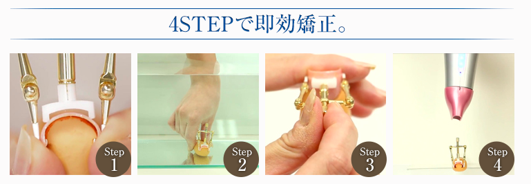①巻き爪ロボを装着し、②足をお湯につけたら、③ツマミを回して矯正、④後はドライヤーで乾かすだけ。通常は時間のかかる巻き爪矯正が、たったの4STEPでカンタンにできます。効果が表れるまでの数ヶ月という長い時間。そんな面倒はもうありません。その場で効果が体感できるカンタン巻き爪矯正が、ご家庭でいつでも可能になりました。
