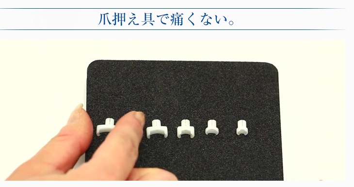 爪押え具は、爪の裏と密着する部分の幅に合わせ、はがされる刺激を加えずに爪の端だけ持ち上げることができる保護パーツ。これにより、痛みなく巻き爪を治すことができるのです。