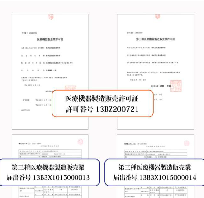 薬事法第2条第4項「医療機器」に基づき、厳しい審査のもとに発行された医療機器許可証。厚生労働省の定める規制に従って、厳格な組織体制、品質管理体制の基準をクリアした工場だけが、医療機器を作ることができるのです。