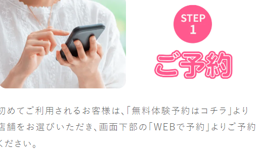初めてご利用されるお客様は、「無料体験予約はコチラ」より店舗をお選びいただき、画面下部の「WEBで予約」よりご予約ください。