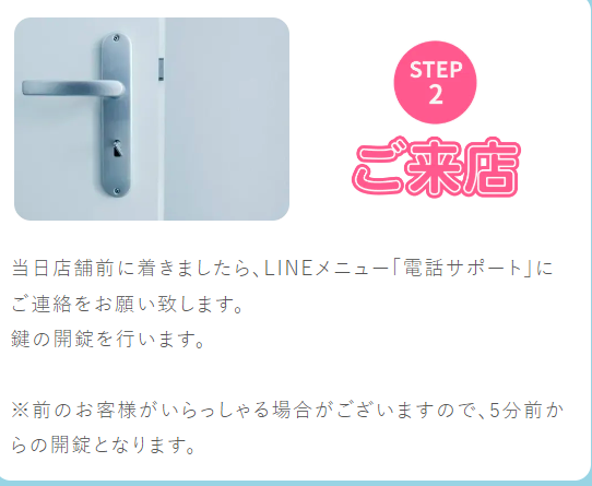 当日店舗前に着きましたら、LINEメニュー「電話サポート」にご連絡をお願い致します。