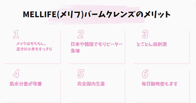 | MELLIFE(メリフ)バームクレンズのメリット | ★メイクはもちろん、 ★日本や韓国でもリピーター急増 ★とことん低刺激 ★肌水分量が改善 |