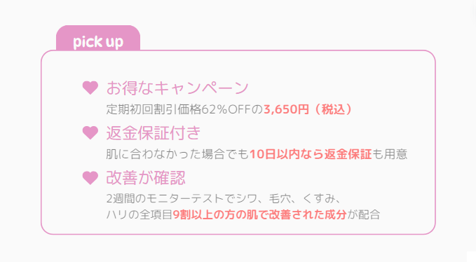 | 定期初回割引価格 | 62%OFFの3,650円(税込)😄 |