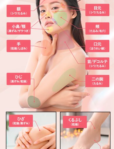 | 使える部分 | 目元、頬、小鼻、顎、 口元、手、ひじ、首、二の腕 ひざ、くるぶし、かかと |