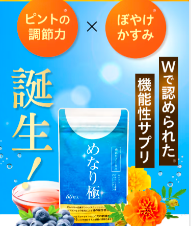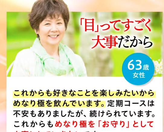 | めなり極 年齢とともに 低下してしまう 目の悩みを すっきり アプローチできると 評判のサプリメントです |