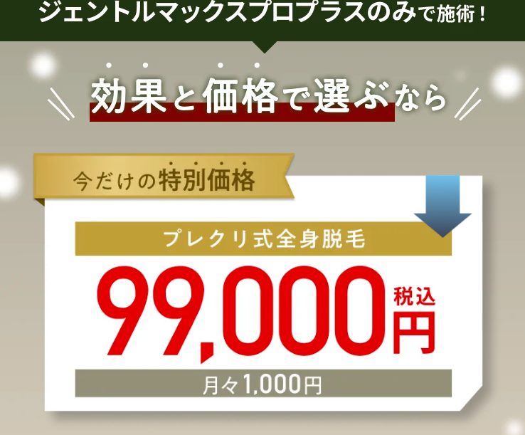 | キャンペーン価格(プレクリ式全身脱毛プラン5回) | 99,000円(税込) |