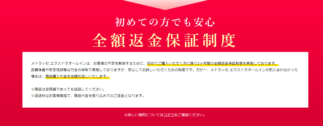 品質検査や安定性試験は万全の体制で実施しておりますが、安心してお試しいただくための制度です。万が一、メトラッセ エクストラオールインが肌に合わなかった場合は、商品購入代金を全額お返しいたします。