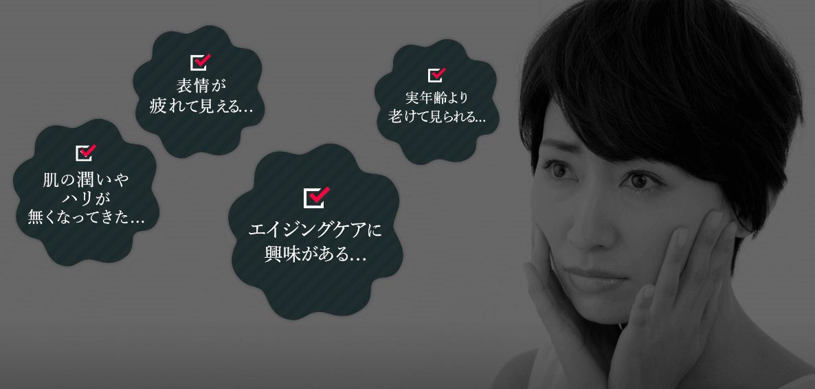 | おすすめの人 | 表情が疲れて見える 肌の潤いやハリがなくなってきた エイジングケアに興味がある 実年齢より老けて見られる |