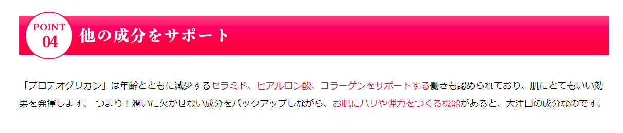 | プロテオグリカン | 肌に潤いを与え、他美容成分をサポート |