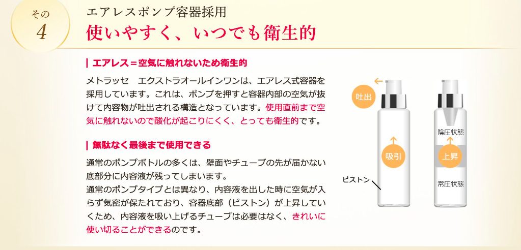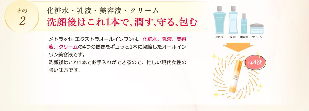 メトラッセエクストラオールインワンは化粧水、乳液、美容液、クリームの4つの働きをギュッと1本に凝縮したオールインワン美容液