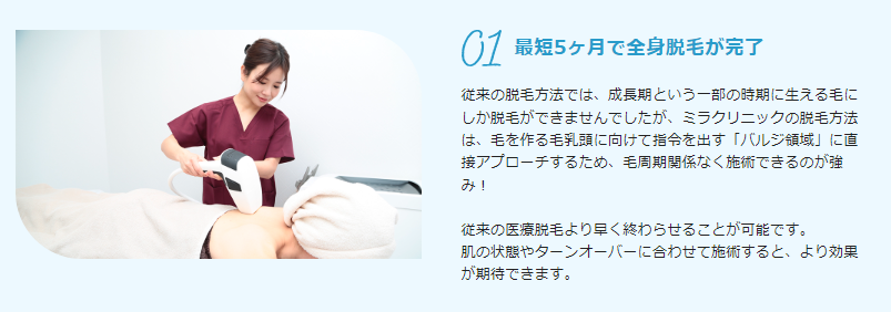 ミラクリニックの医療脱毛は、女性専用・医療機関ならではの安心感が特徴です。